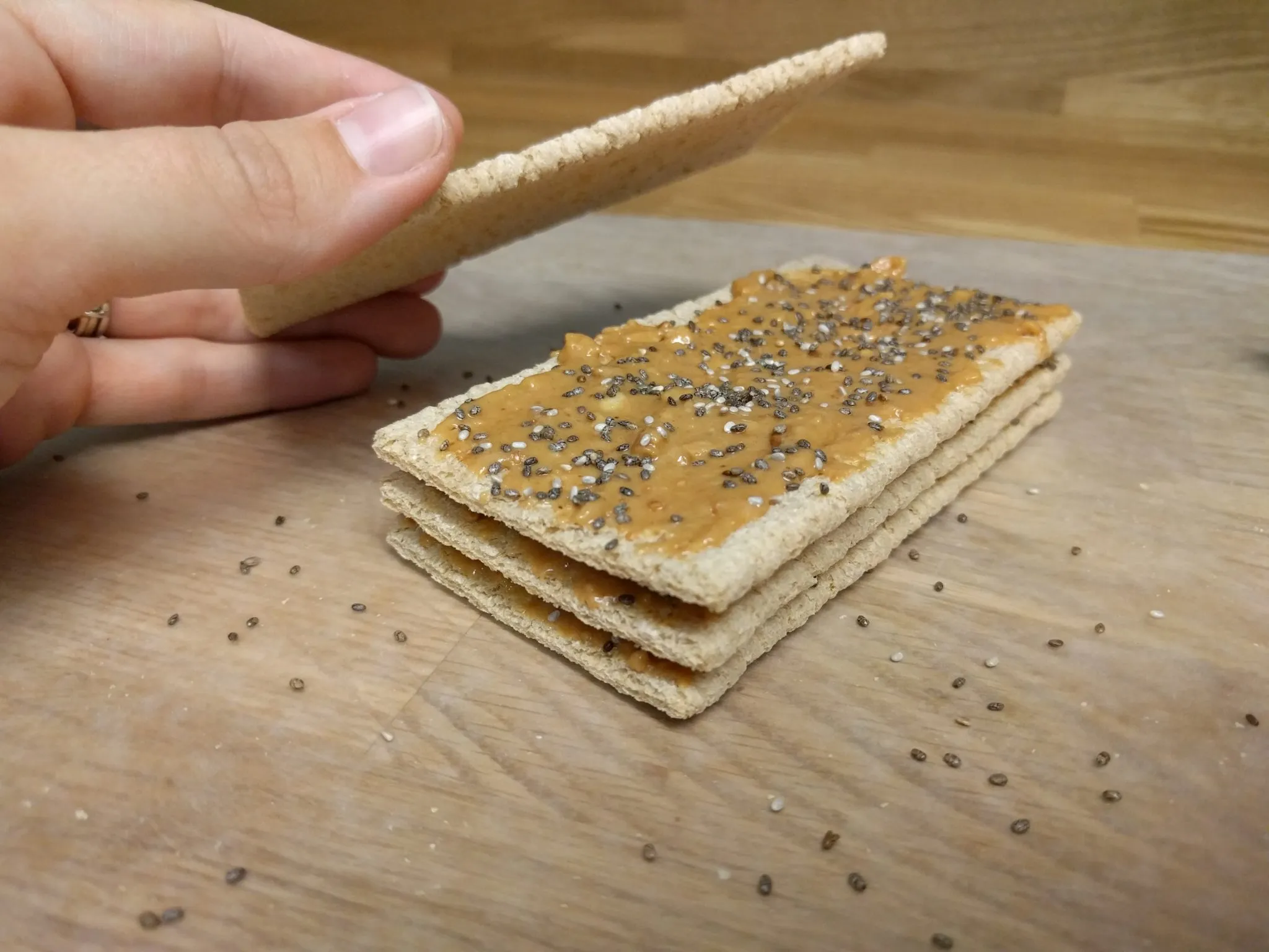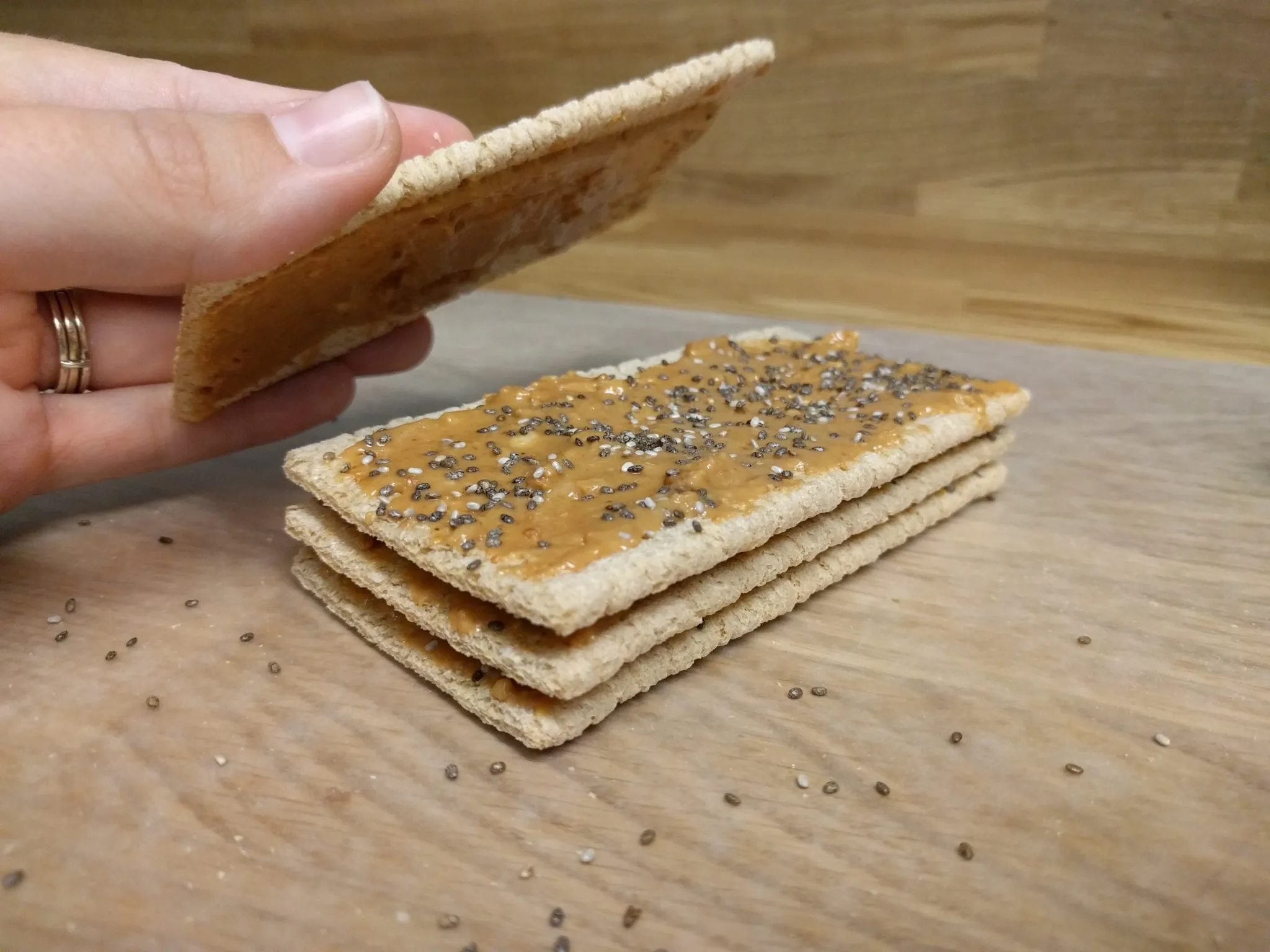 - Spoon a thin layer of peanut butter on cracker and sprinkle with chia seeds. Repeat 3 times stacking each cracker on top of the other.