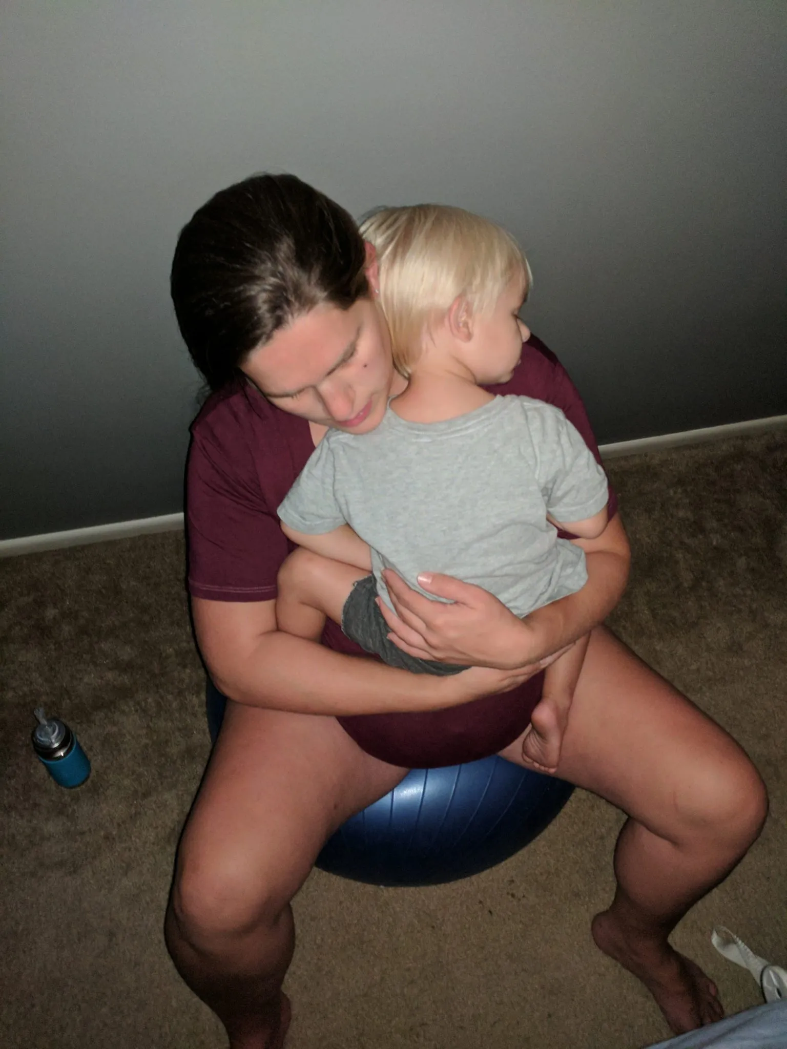Right after I had said for Sizzly to come and Tiffany and Amber arrived, things seemed to pick up instantly. Contractions were all of a sudden averaging 2-4 minutes apart, and I was already having to make noises to work through them while Stefen pushed my lower back / hips together through every one. I was once again determined to have a water birth. Sizzly was probably tired of me asking if she’d have the pool with her. Stefen was hooking up the hose in our shower to fill the pool when she got here. The adapter didn’t work so he was duct taping it on, having to take a break every couple minutes to hold me through contractions.