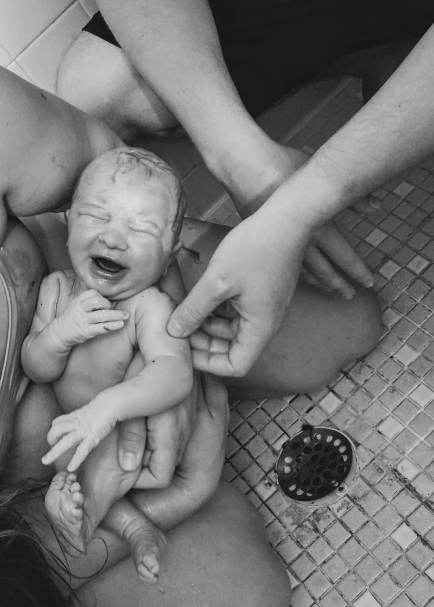 I was now holding onto Stefen with one arm and the shower door with my other. With the next contraction I knew I needed to change positions, so I just got on my hands and knees. I really wanted to lie down since that’s what I did with Houston and I knew it was more comfortable than the position I was in now. Sizzly kept encouraging me to do whatever I wanted, lie in the shower, get out and go on the floor, etc. But with the next contraction I just decided the best way to get comfortable would be to push her out, so I did that. In just a few pushes and under 4 minutes she was out and crying like a pro.