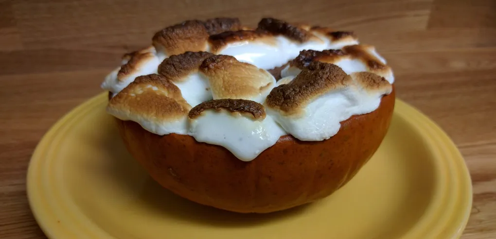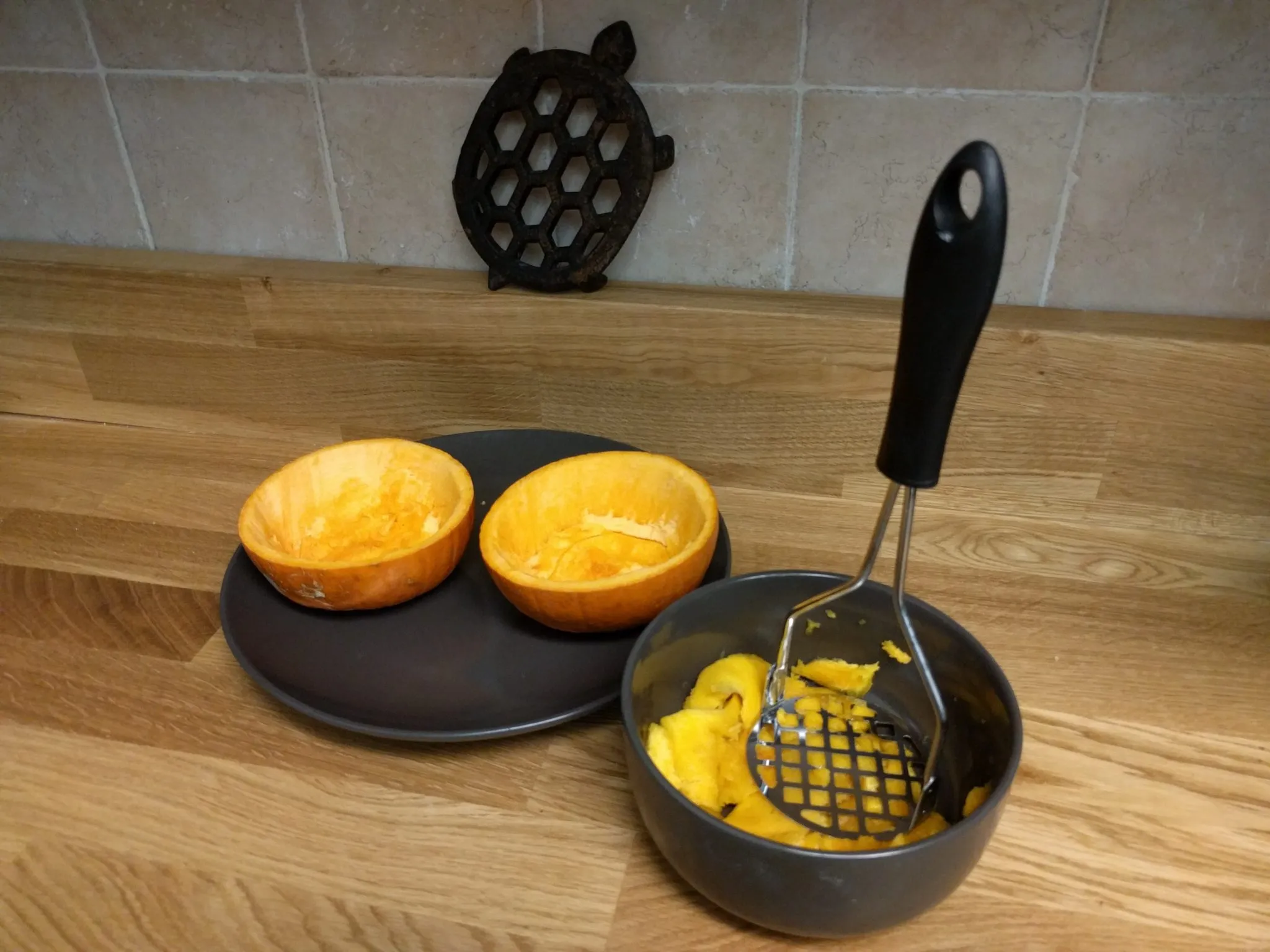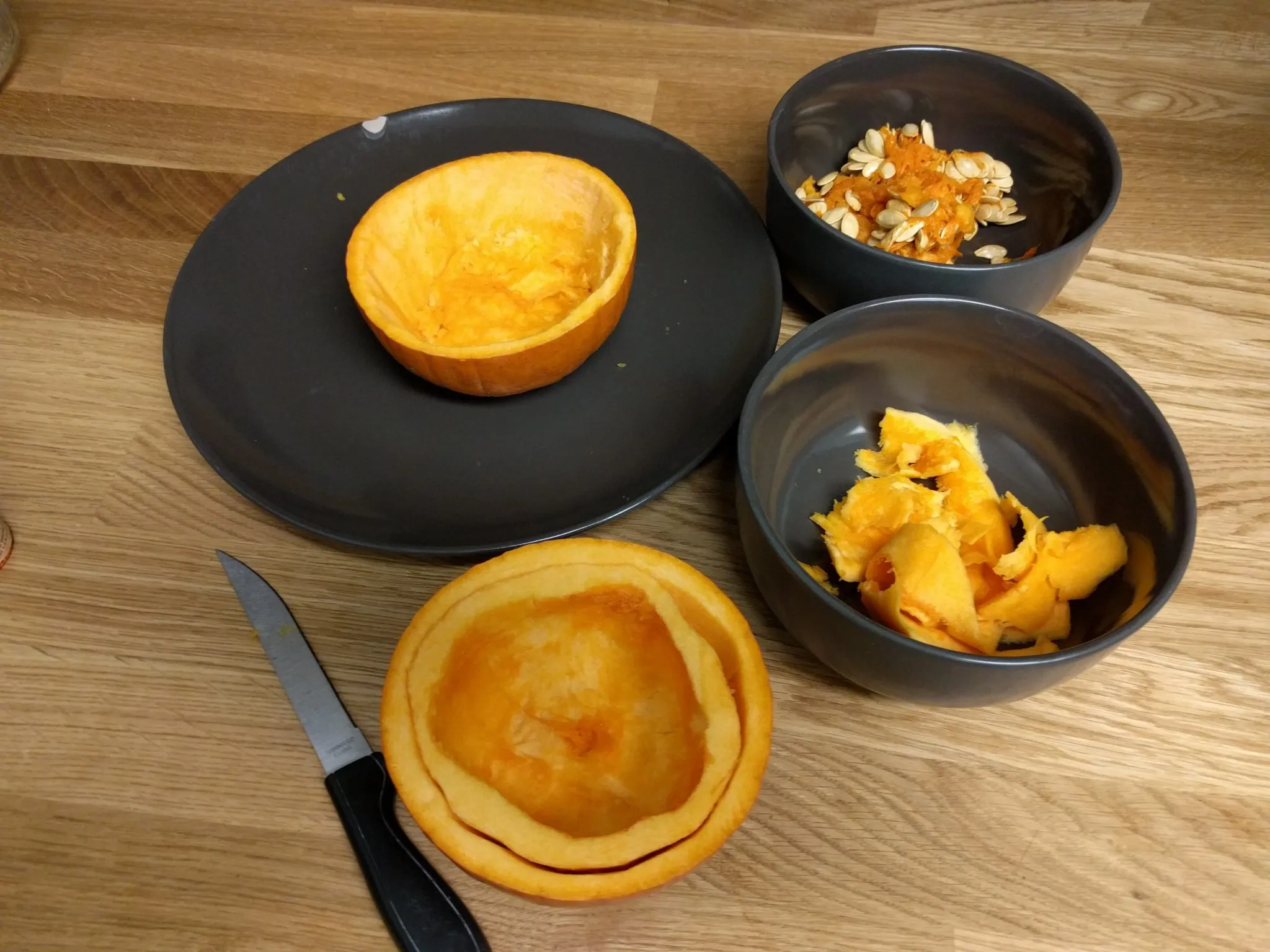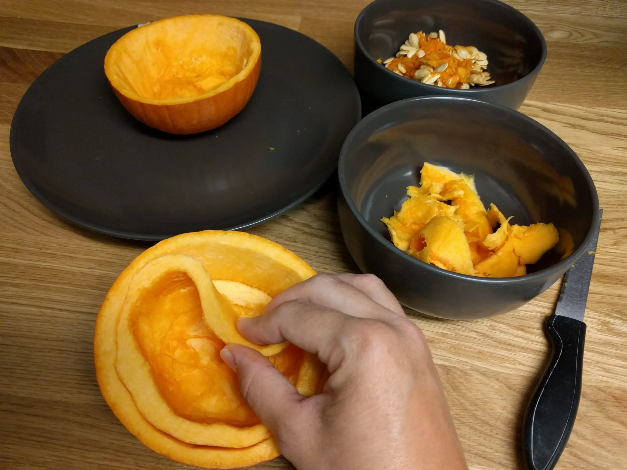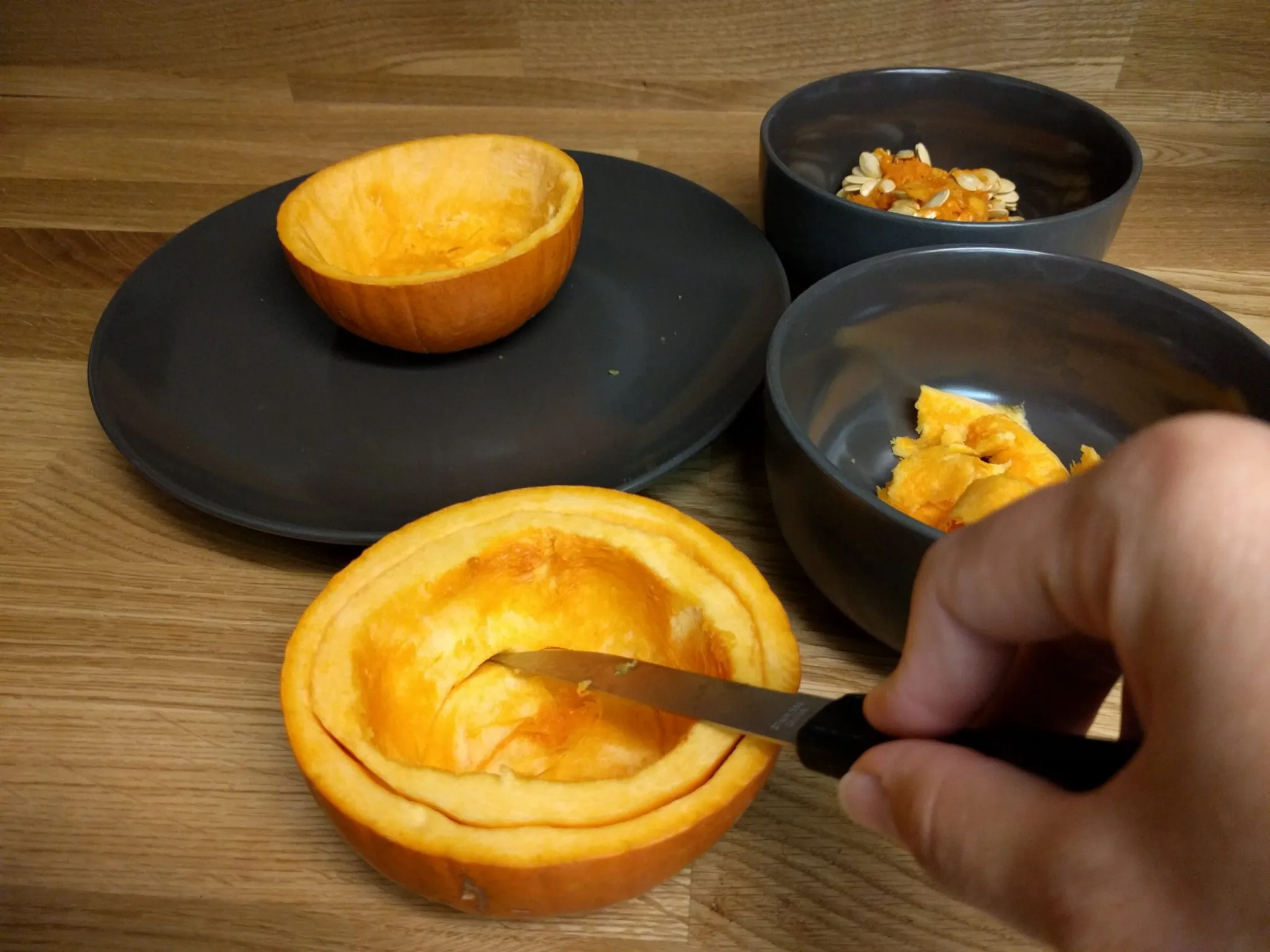 - Cut pumpkin in half and scoop out insides. If using fresh pumpkin, prepare it at this time.*