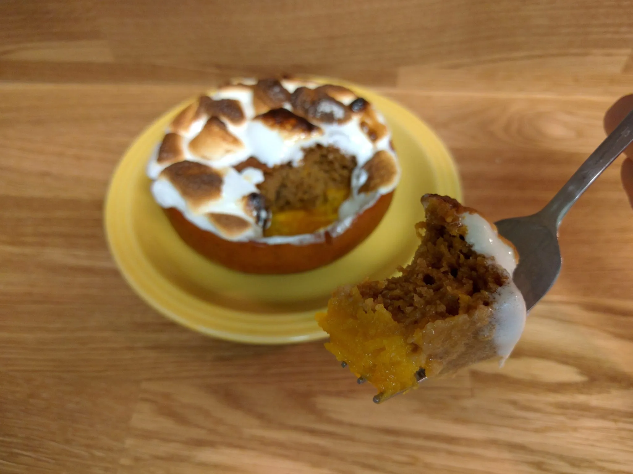 I got about 1/3 cup out of mine. For this particular recipe since you only need 1/4 cup you don’t have to worry about scooping it all out. Whatever you leave in the pumpkin will cook with the cake, and if you’re lucky when you take a bite you’ll get a little layer of fresh pumpkin with your cake, as pictured above.